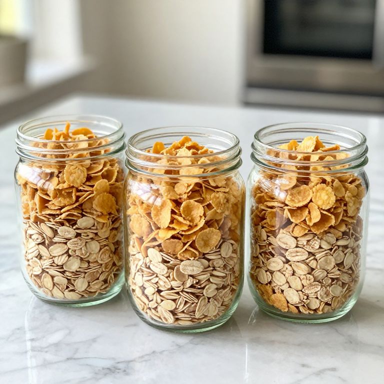 Three transparent glass jars filled with layers of golden cornflakes and light-colored müsli are neatly arranged on a marble countertop, showcasing a vibrant and fresh breakfast setup indoors under natural daylight.