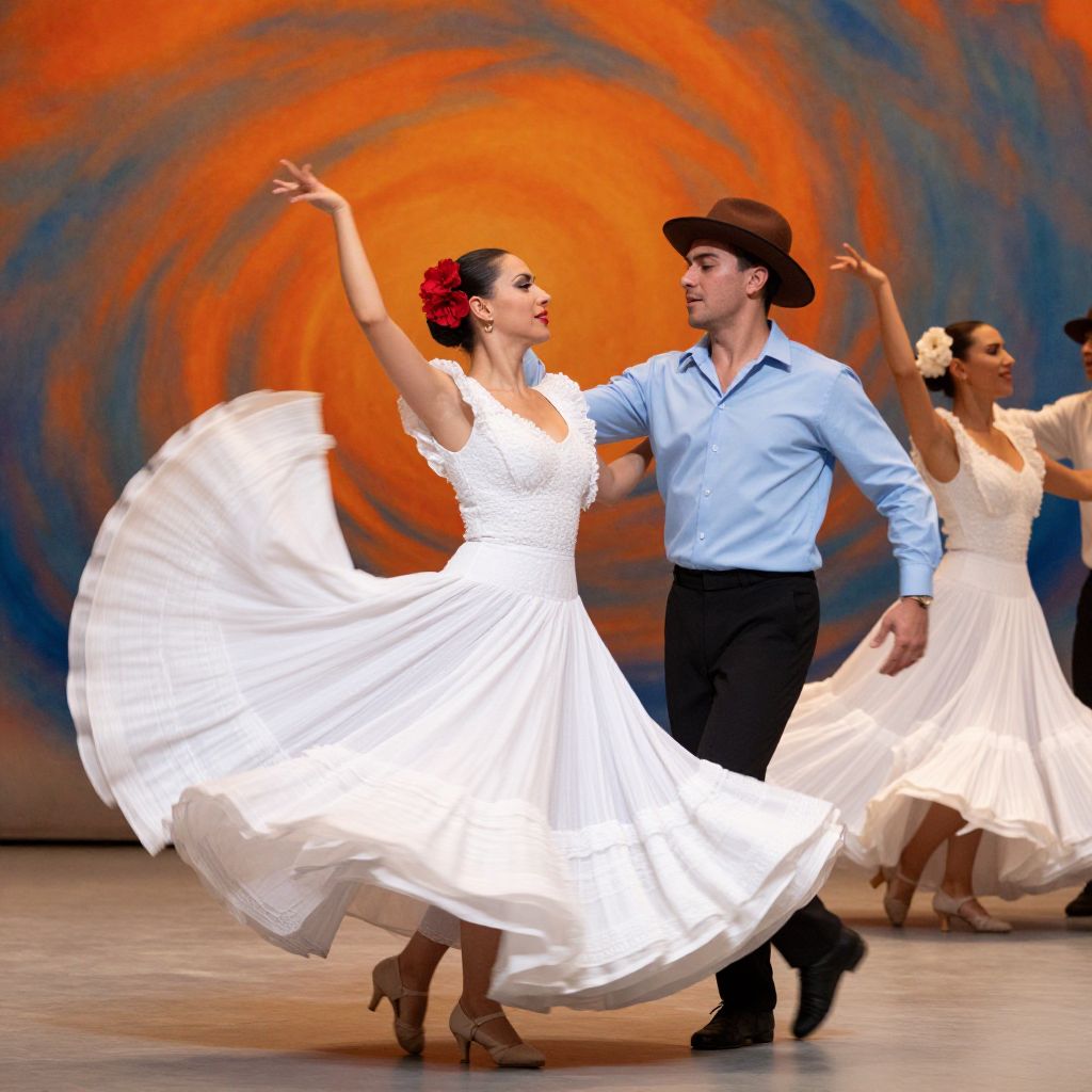 Vibrant dancers captured in mid-motion, a woman in a flowing white gown adorned with a red flower in her hair and a man in a light blue shirt and brown hat, set against a dynamic backdrop of swirling orange and blue hues, embodying the essence of \"El Gallo\" by Holly Wood.