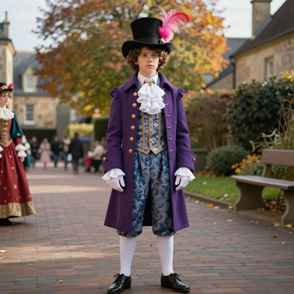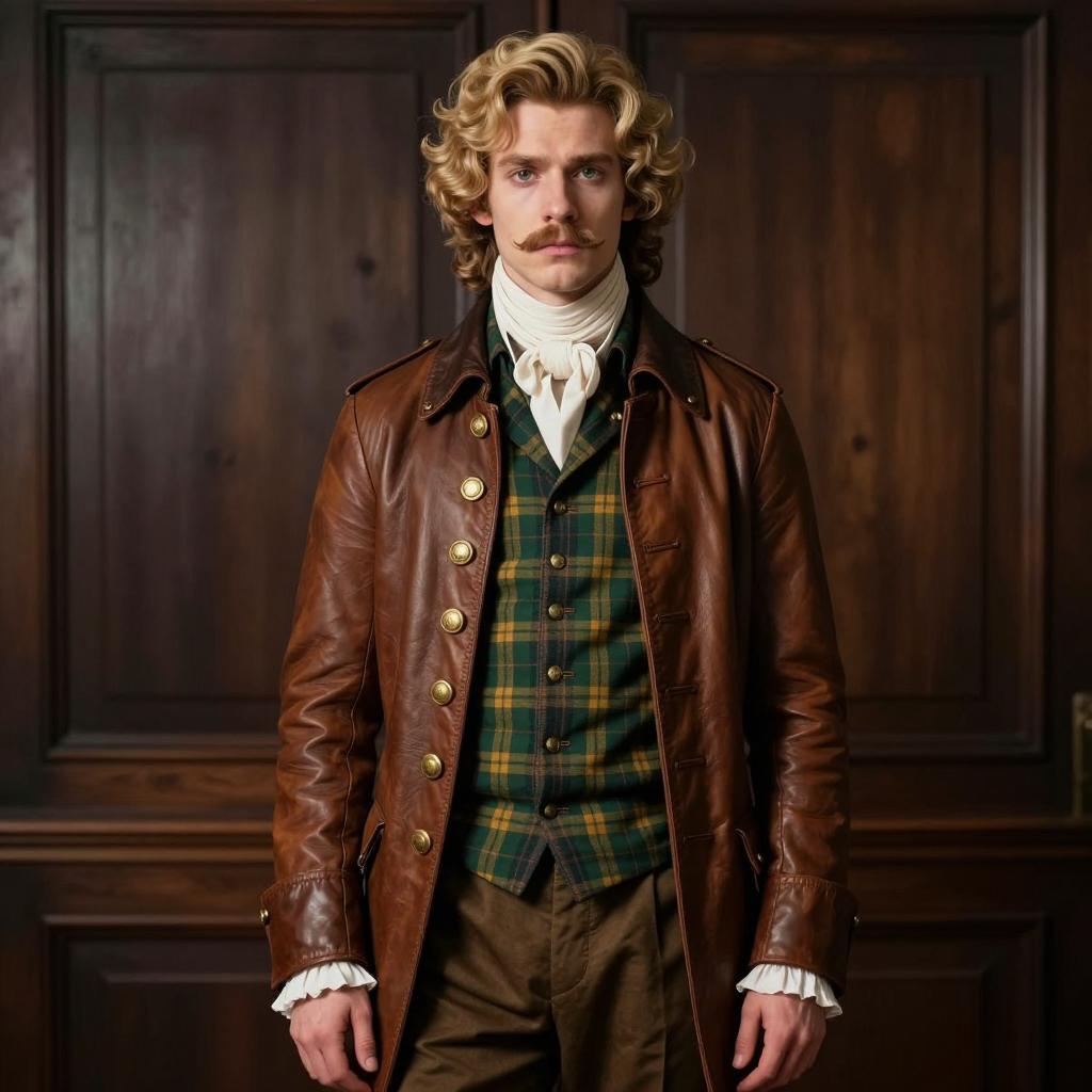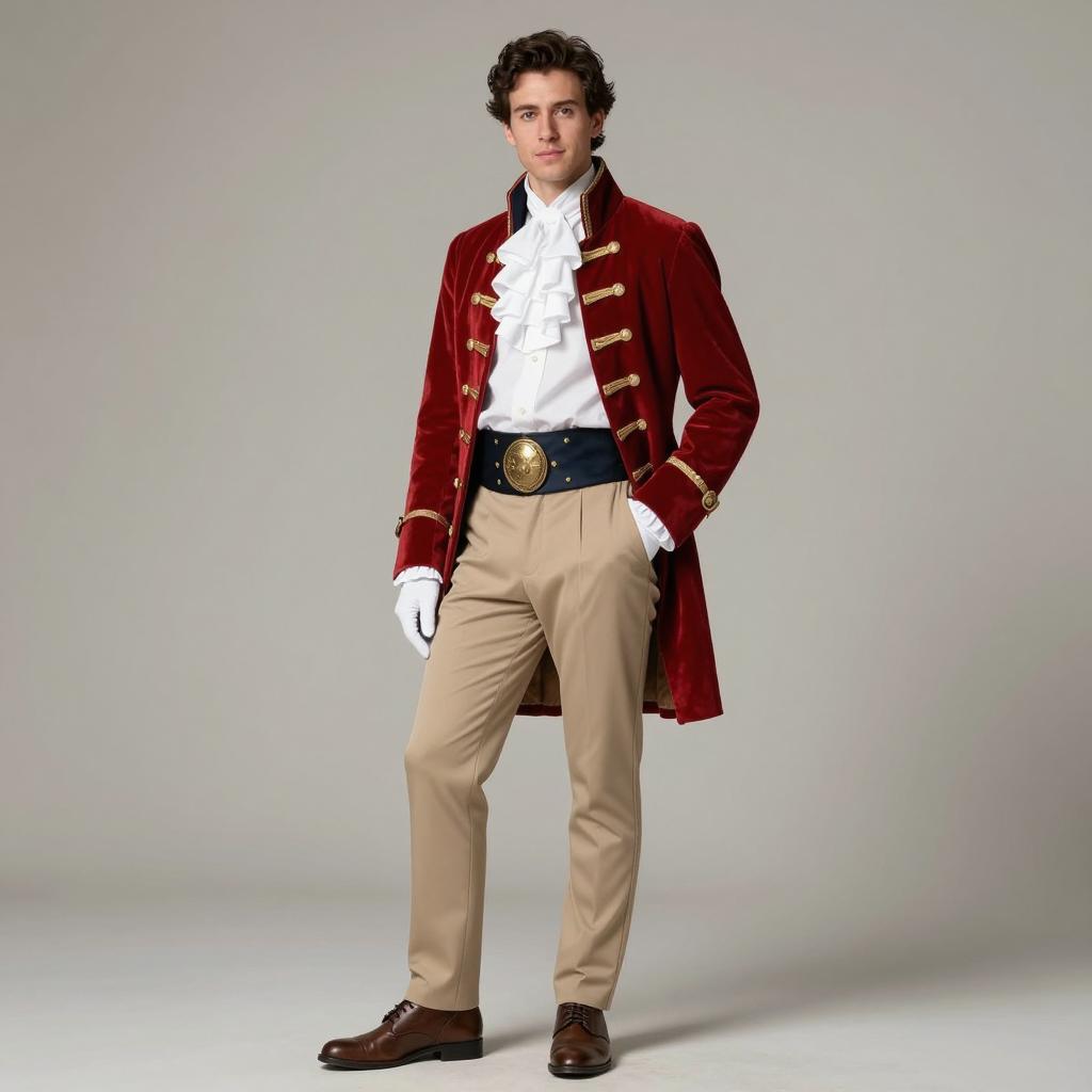 French aristocrat costume, photograph, male model, standing in a grand hallway, baroque architecture, natural light, checkered floor, hands behind back, long golden embroidered coat, white ruffled collar, green vest and pants, short dark hair, symmetrical composition, blurred background with people, elegant and historical style, classical setting, regal and sophisticated atmosphere, fashion photo, haute couture
