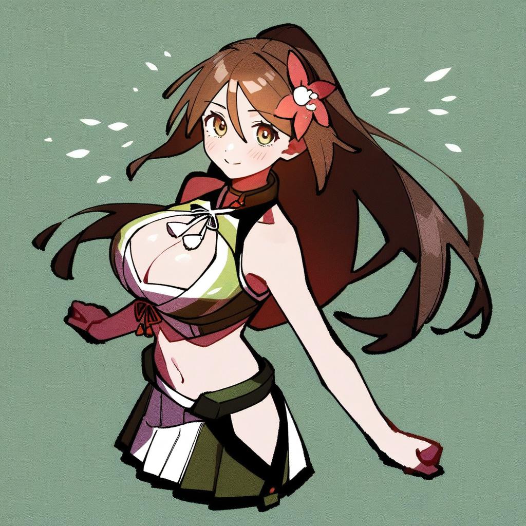 Amagi kai (kancolle), kantai collection, 1girl, brown eyes, hair between eyes, mole under eye, brown hair, long hair, ponytail, hair flower, large breasts, cleavage, cleavage cutout, navel, hip vent, bare shoulders, midriff, crop top, by artist nploser, animagine