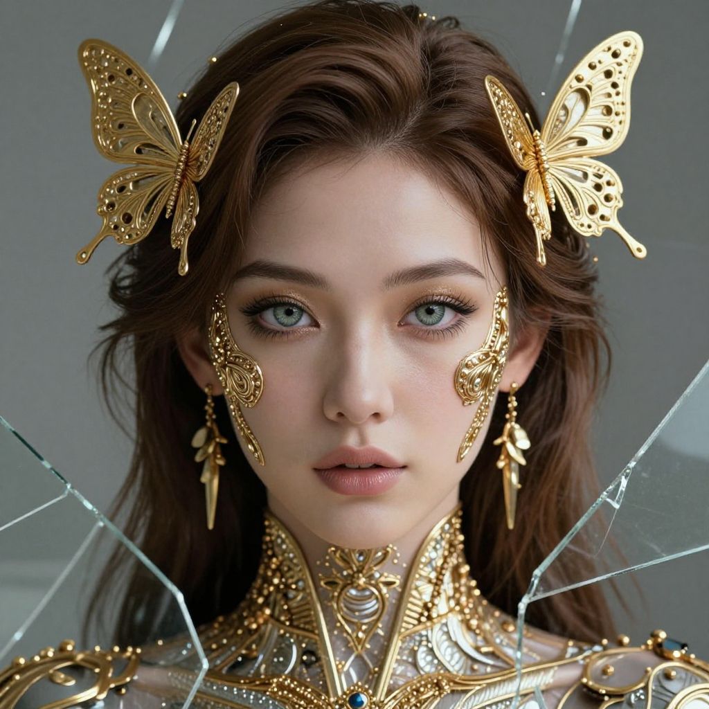 Portrait of beautiful cyborg with brown hair, intricate, elegant, highly detailed, majestic, gold butterfly filigree, broken glass, (masterpiece, sidelighting, finely detailed beautiful eyes: 1.2), 1girl