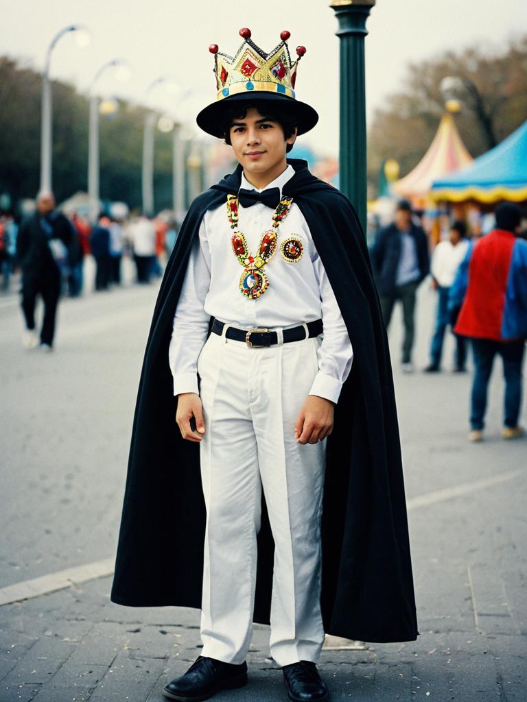 Mecca carnival costume, male focus, pants, 1boy, outdoors, crown, shirt, hat, blurry, blurry background, solo focus, lamppost, full body, white shirt, black hair, standing, long sleeves, cape