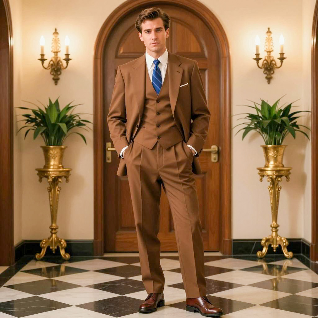 Eighties films costume, photograph of handsome man standing in elegant hallway, wearing brown three-piece suit, blue striped tie, white shirt, brown leather shoes, hands in pockets, short dark brown hair, wooden archway in background, checkered black and white floor, two wall-mounted candle sconces, two ornate gold plant stands with green plants, warm lighting, refined and sophisticated style, full body shot, standing pose, detailed ures, formal attire, classical architecture, rich colors, stylish and polished look