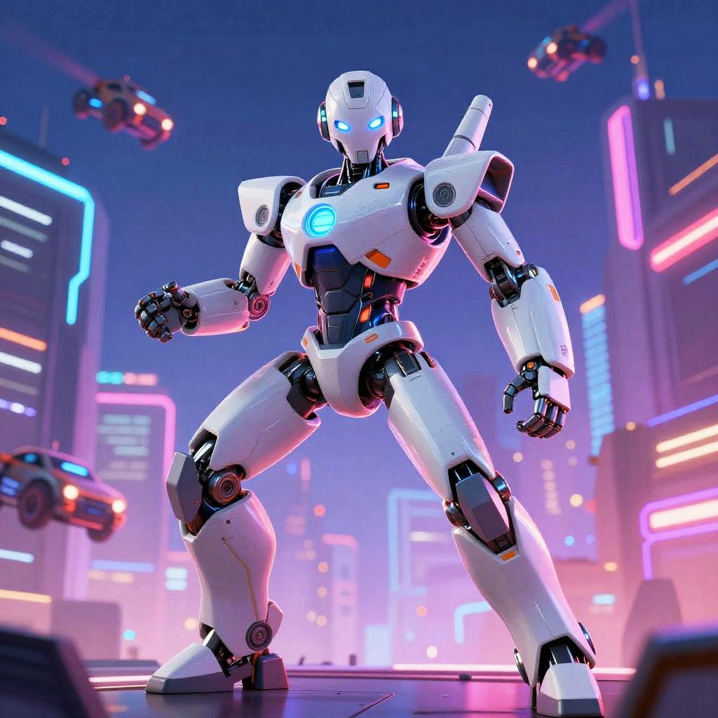 Zone of the Enders art style featuring futuristic mechs in a vibrant sci-fi cityscape, dynamic action poses, detailed armor with glowing neon highlights, and vibrant atmospheric lighting.
