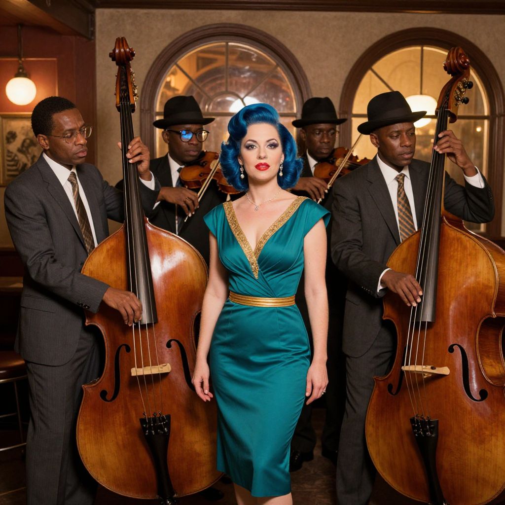 In this vibrant 1930s Harlem Jazz club, a quintet of musicians, styled in the distinctive fashion of Aaron McGruder, prepares to perform. The central figure, a woman with voluminous blue hair, exudes elegance in her teal dress adorned with gold accents. She stands confidently, her presence commanding attention. To her left, a man in a sharp suit and tie holds a double bass, his posture relaxed yet poised. Behind her, another musician in a suit and hat plays the violin, his glasses reflecting the ambient light. To the right, a man in a suit and hat, also holding a double bass, stands ready. In the background, a third musician in a suit and hat is partially visible, adding to the ensemble's depth. The scene is set against a backdrop of arched windows and warm, dim lighting, creating a cozy atmosphere that enhances the anticipation of the upcoming performance. The overall composition is dynamic, with each musician positioned to create a balanced and engaging visual narrative.