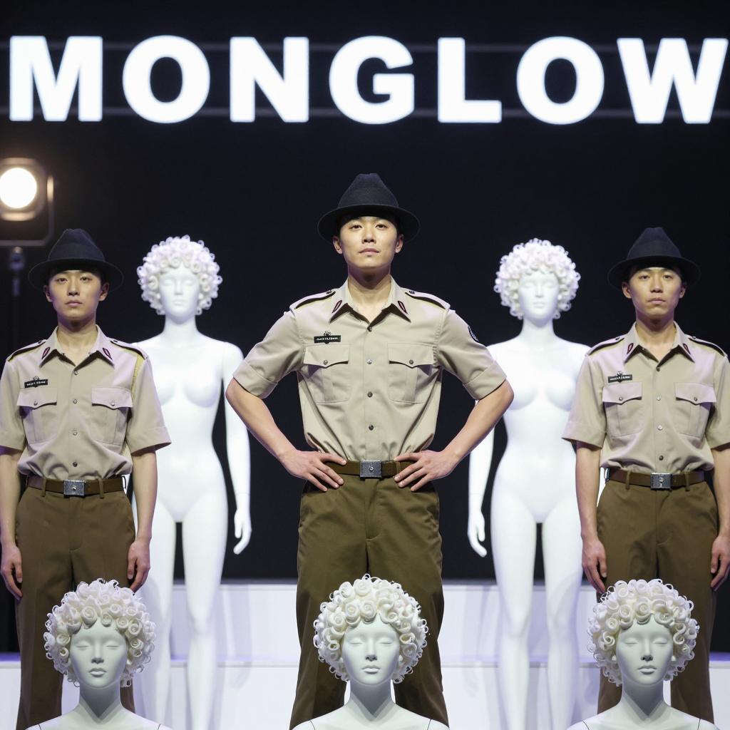 A theatrical stage performance featuring a central male figure dressed in a beige military-style shirt with red insignia and a black hat, standing confidently with hands on his waist. Flanked by two men in similar attire, all three actors stand in front of white mannequins with curly white wigs and exposed torsos. The setting is illuminated by bright stage lights with the word 'MOINGLOW' displayed prominently in large illuminated white letters in the background.