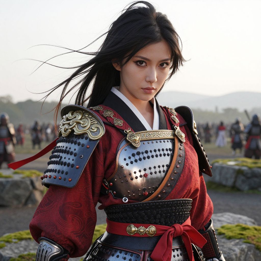 Photorealistic digital image of an Asian woman in traditional Japanese samurai armor, red kimono, and black pauldrons, standing outdoors with a