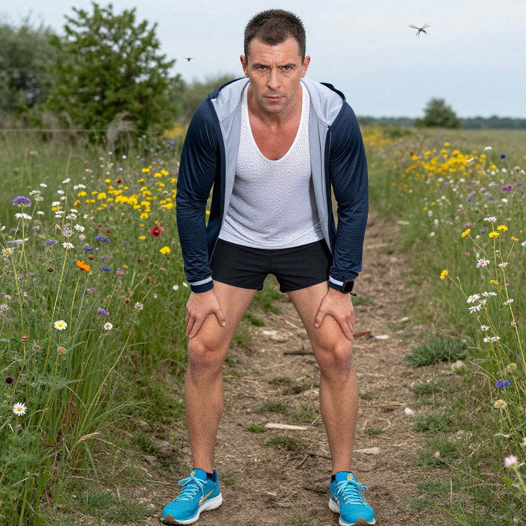 A man, lightweight moisture-wicking long-sleeve shirt, breathable mesh tank top, slim-fit running shorts, reflective running jacket, vibrant blue running shoes, muddy trails, vibrant wildflowers, buzzing dragonflies, camera obscura style, focused expression. Man has masculine face and piercing eyes