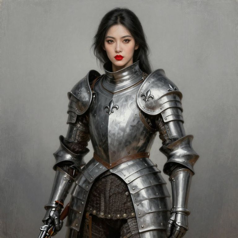 Illustration, detailed oil painting, portrait of stunning female oriental knight, red lips, dark eye make-up, plate armour adorned with Fleur de Lys, armoured gloves, greaves, cowboy shot, monochrome with spot colour