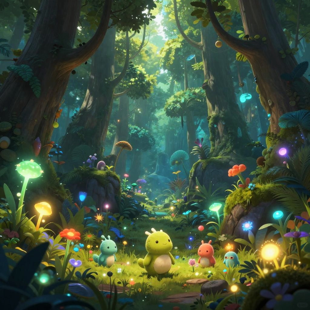Liliputienses, tiny whimsical humanoid creatures, nestled in a lush green forest with oversized flowers and mushrooms, soft glowing lights around them, vibrant colors, detailed nature environment, fantasy style, magical atmosphere, highly detailed, ethereal lighting
