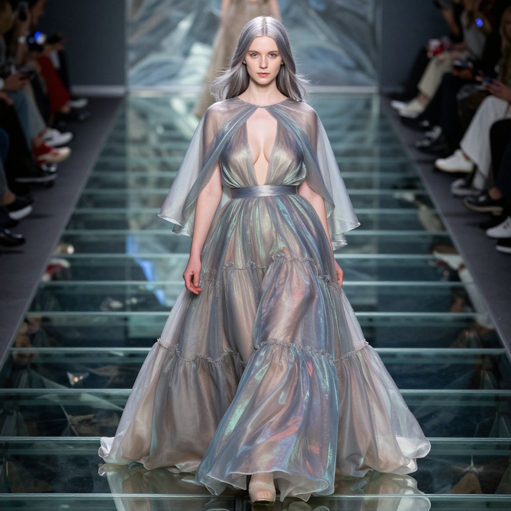 Photograph of a fashion runway show featuring a young woman with long, straight, dark hair and fair skin. She wears a floor-length, iridescent silver dress with a deep V-neck, revealing a significant amount of cleavage. The dress has sheer, flowing sleeves and a full, layered skirt. She walks on a glossy, black, reflective runway, with a blurred audience on either side. The background is dark, focusing attention on her and the illuminated runway. The overall style is futuristic and ethereal, with the dress's iridescent fabric catching light and creating a shimmering effect.