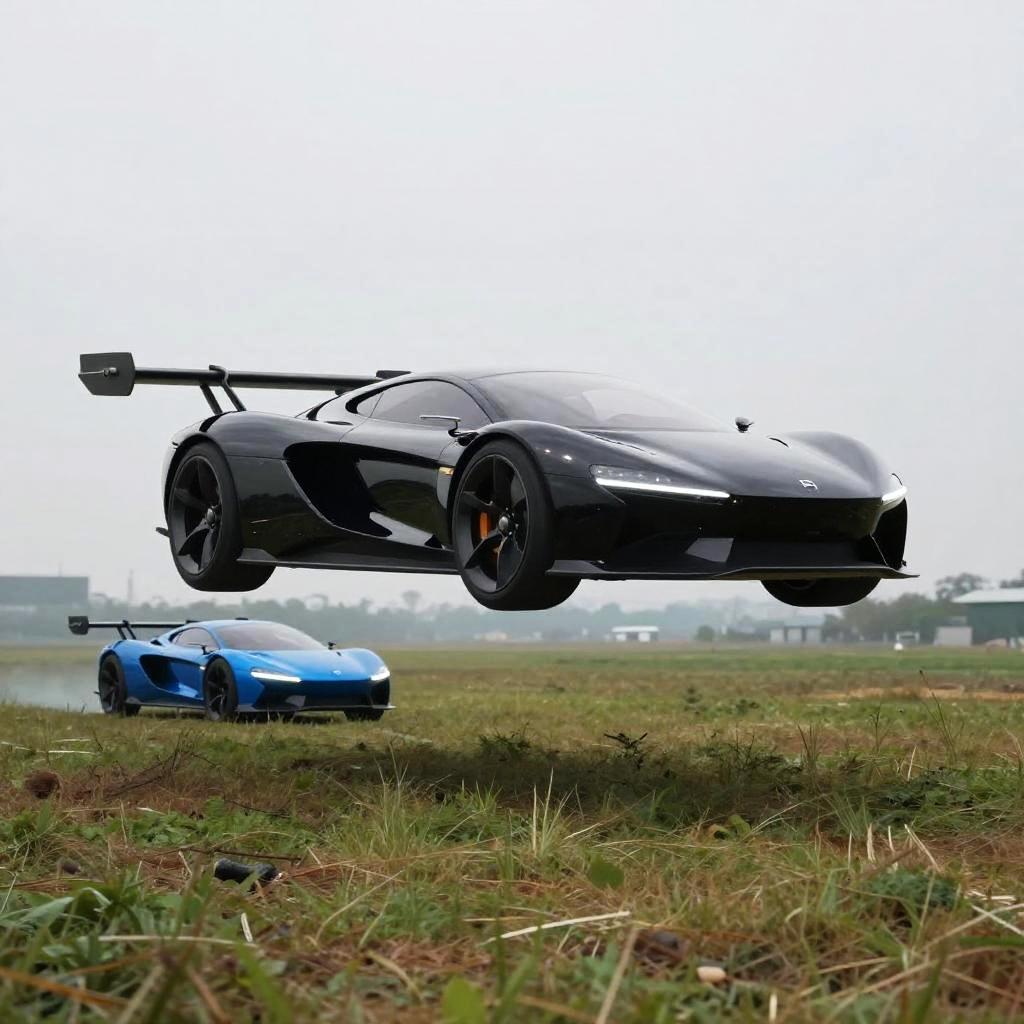 Photograph of a surreal scene: a sleek, black, futuristic flying car hovers above a grassy field, while a traditional dark grey sports car drives on the road below. The sky is overcast with a pale grey and white cloud cover. The grass is green with patches of brown, and the road is a smooth, grey asphalt. The flying car's design is aerodynamic and smooth.