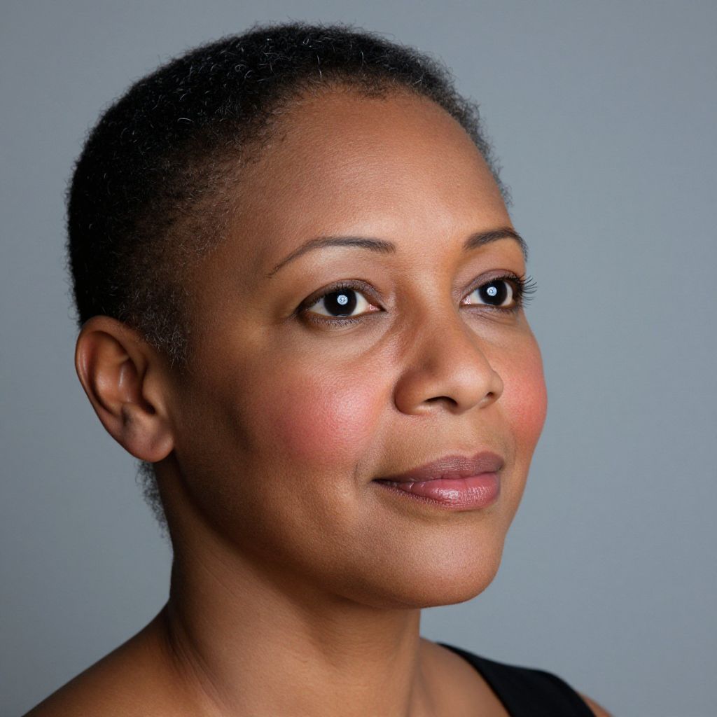Photograph of a Black woman with medium brown skin and short, curly hair pulled back. She has dark brown eyes, arched eyebrows, and is wearing pink lipstick. Her cheeks have a subtle blush. She is looking slightly to the right with a gentle smile. She wears a black top against a plain, light gray background. The image is well-lit with soft lighting highlighting her facial features, creating a natural and professional portrait style.
