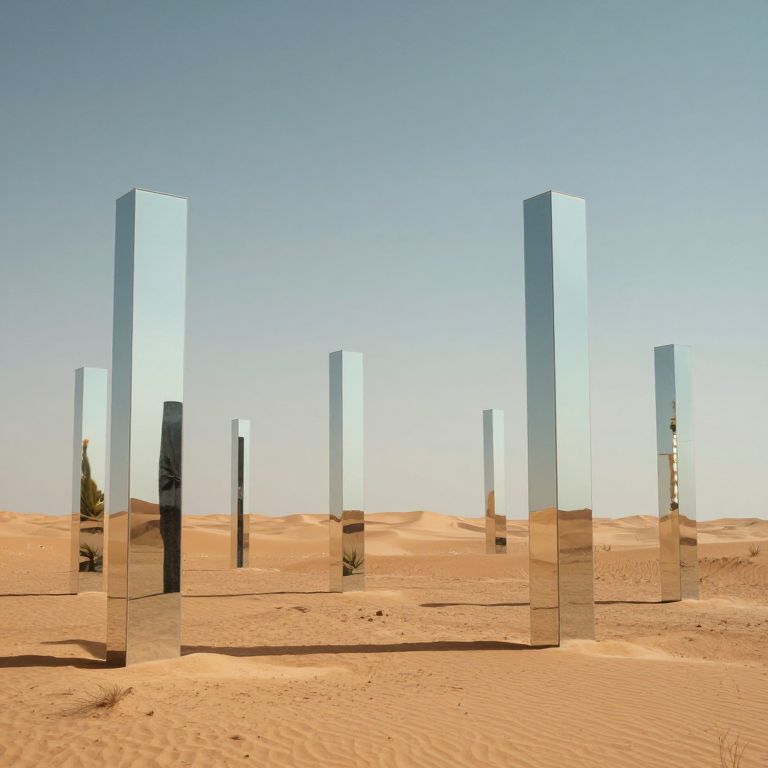 In a serene desert expanse, mirrored pillars stand as silent sentinels, their reflective surfaces distorting reality into a kaleidoscope of alternate worlds, each fragment whispering the echoes of infinite possibilities and the quiet mystery of existence.