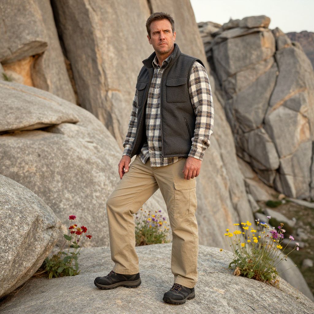 A man, khaki cargo pants, checkered flannel shirt, insulated charcoal vest, rugged black trail shoes, quick-dry long-sleeve shirt, granite cliffs, sunlit crags, vibrant wildflowers, hand-tinted photograph, thoughtful expression. Man has masculine face and piercing eyes