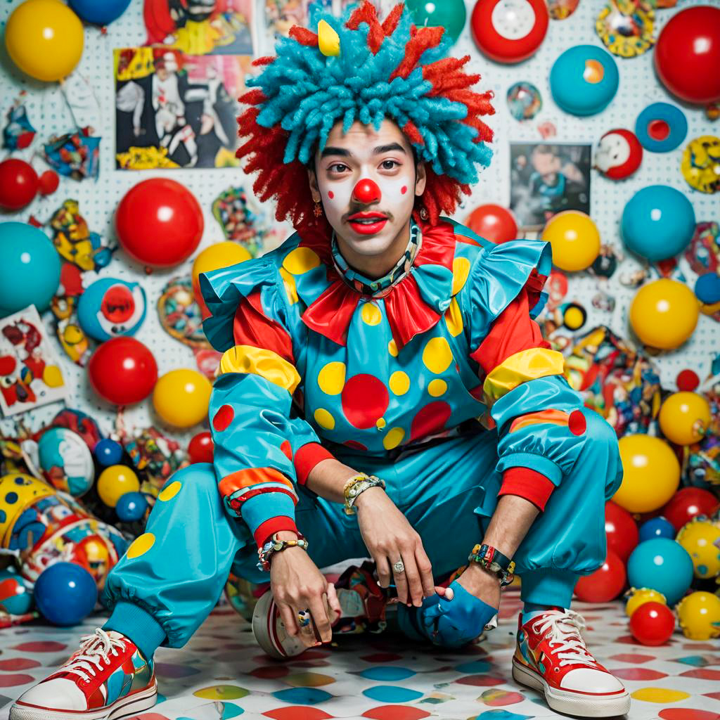 Photo of a proportionate body person, spiky hairdo, clown outfit, colorful and oversized with polka dots and stripes, bright red nose, curly wig, ruffled collar, cargo, sneaker-style, turquoise polyester, photo studio, comic book style