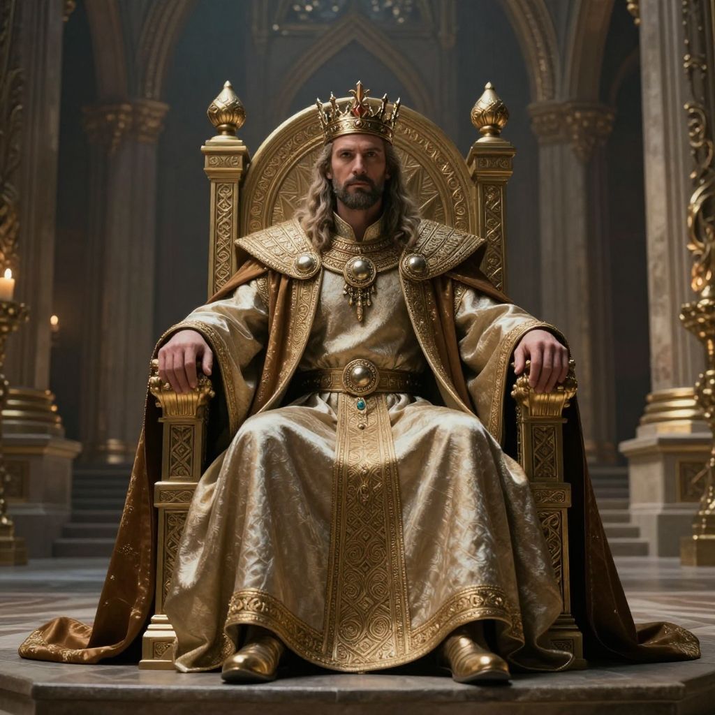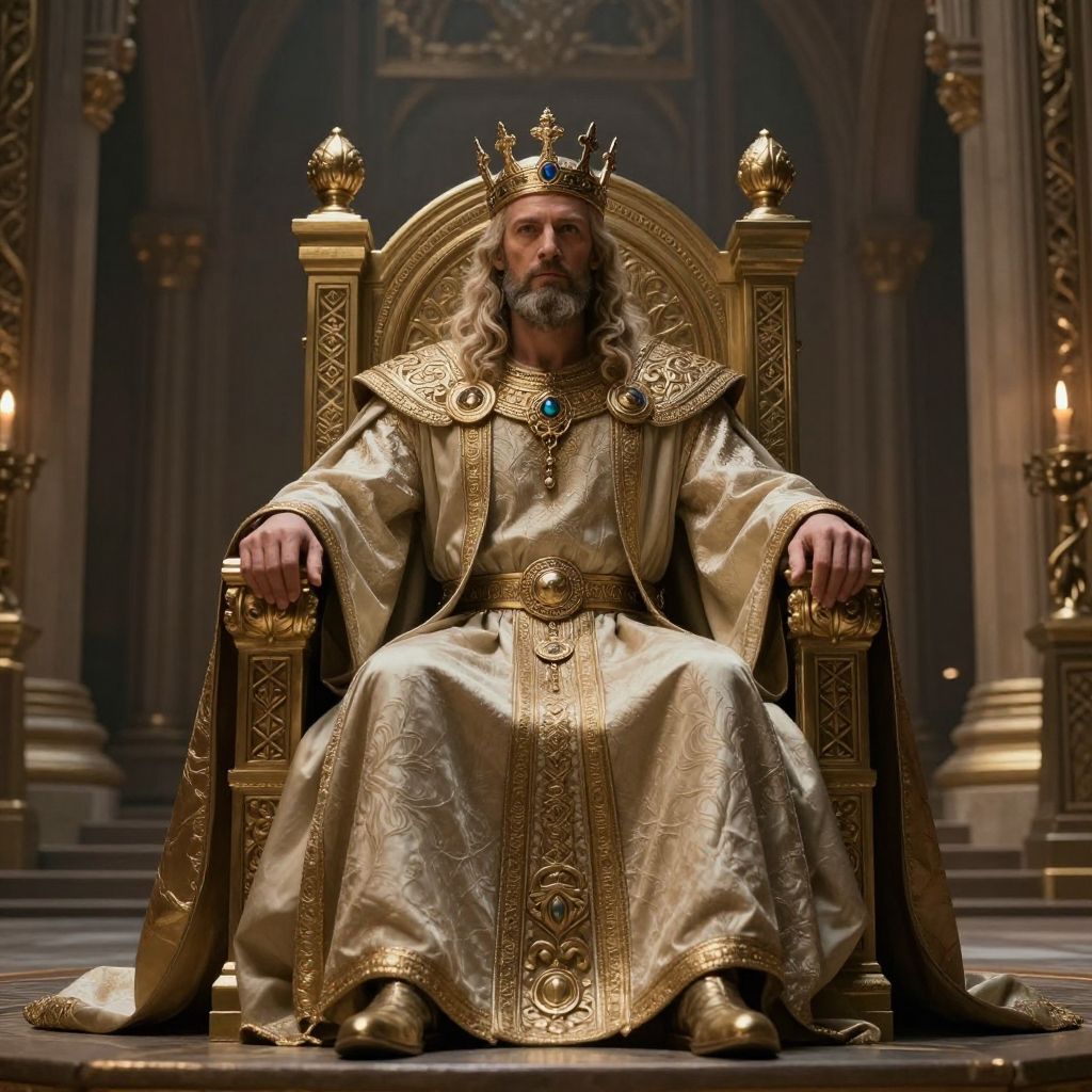 Numenorian king seated on ornate throne in grand hall, adorned with regal robes and jeweled crown, medieval fantasy style, opulent architecture, dramatic shadows and highlights