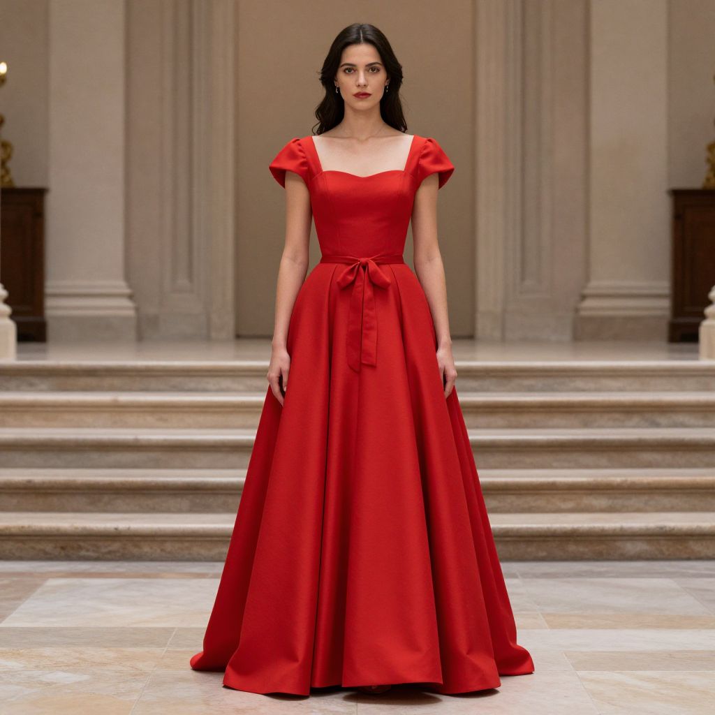 Queen Red Dress, a woman in a red dress and tiable standing in a hall