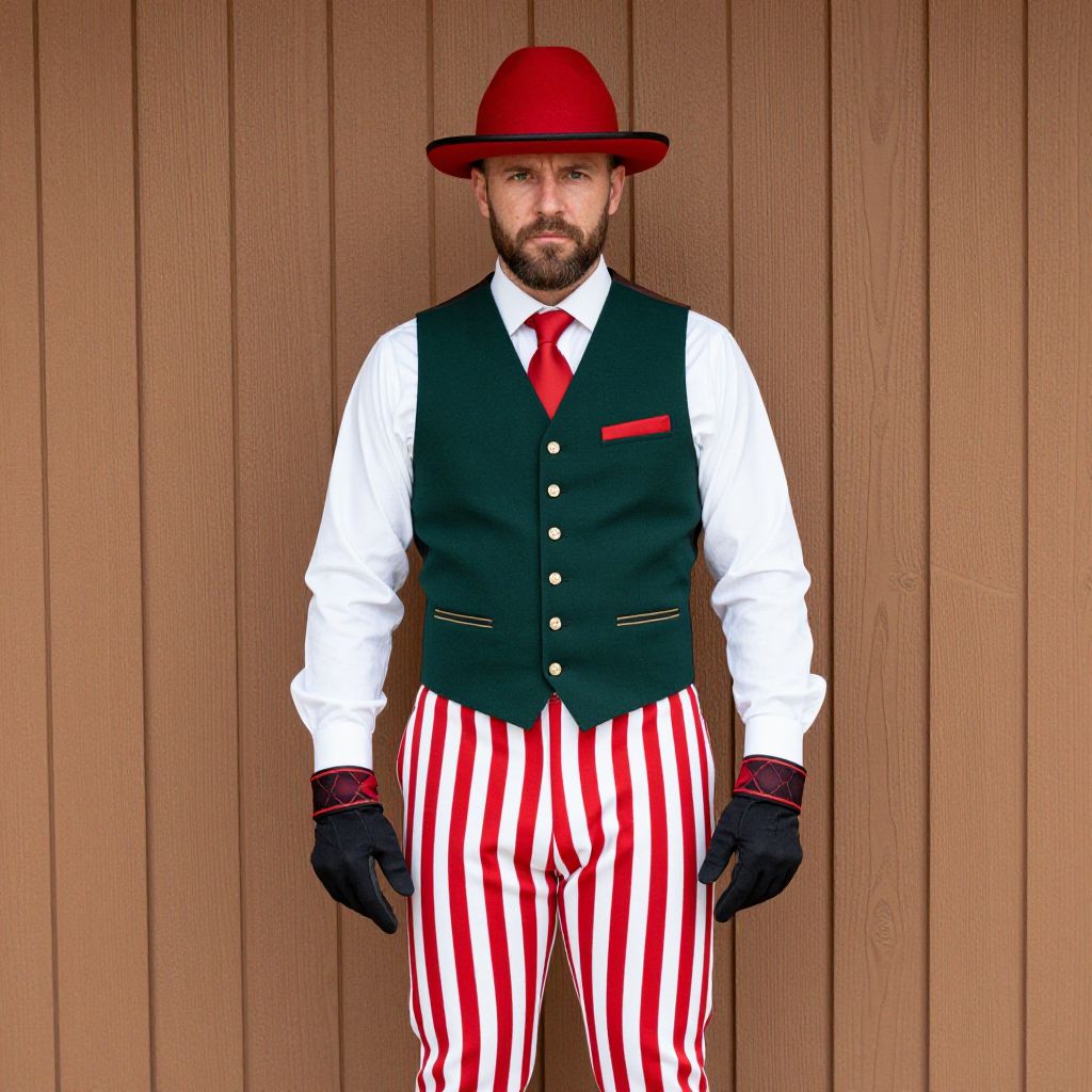 A man with a red hat and a beard is standing in front of a wooden wall. He is wearing a red and white striped pants, a white shirt, a red tie, a green vest, and a pair of gloves. He has a strong, rugged appearance with a confident demeanor, exuding a sense of authority and tradition. His red hat and clothing create a striking contrast against the natural wooden texture of the wall, emphasizing his presence and the timeless elegance of his attire.