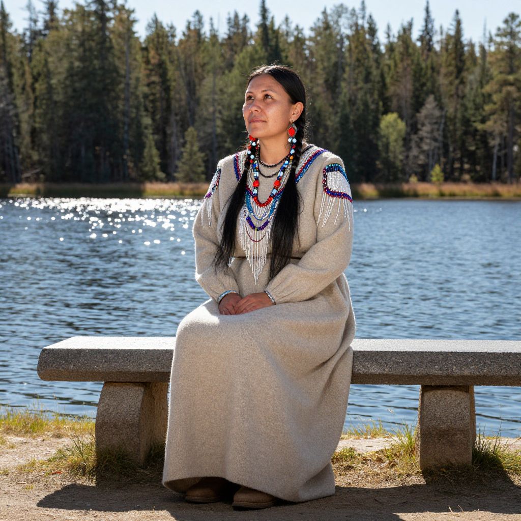 A dignified shot of an Indigenous woman in traditional attire, sitting on a stone bench near a lake in the Canadian boreal forest, wearing a long flowing dress made of cedar and wool, intricate beadwork on her shoulders, with sunlight reflecting off the water, her face serene and peaceful, eyes reflecting the calm of nature.. The woman has big breasts and cute face