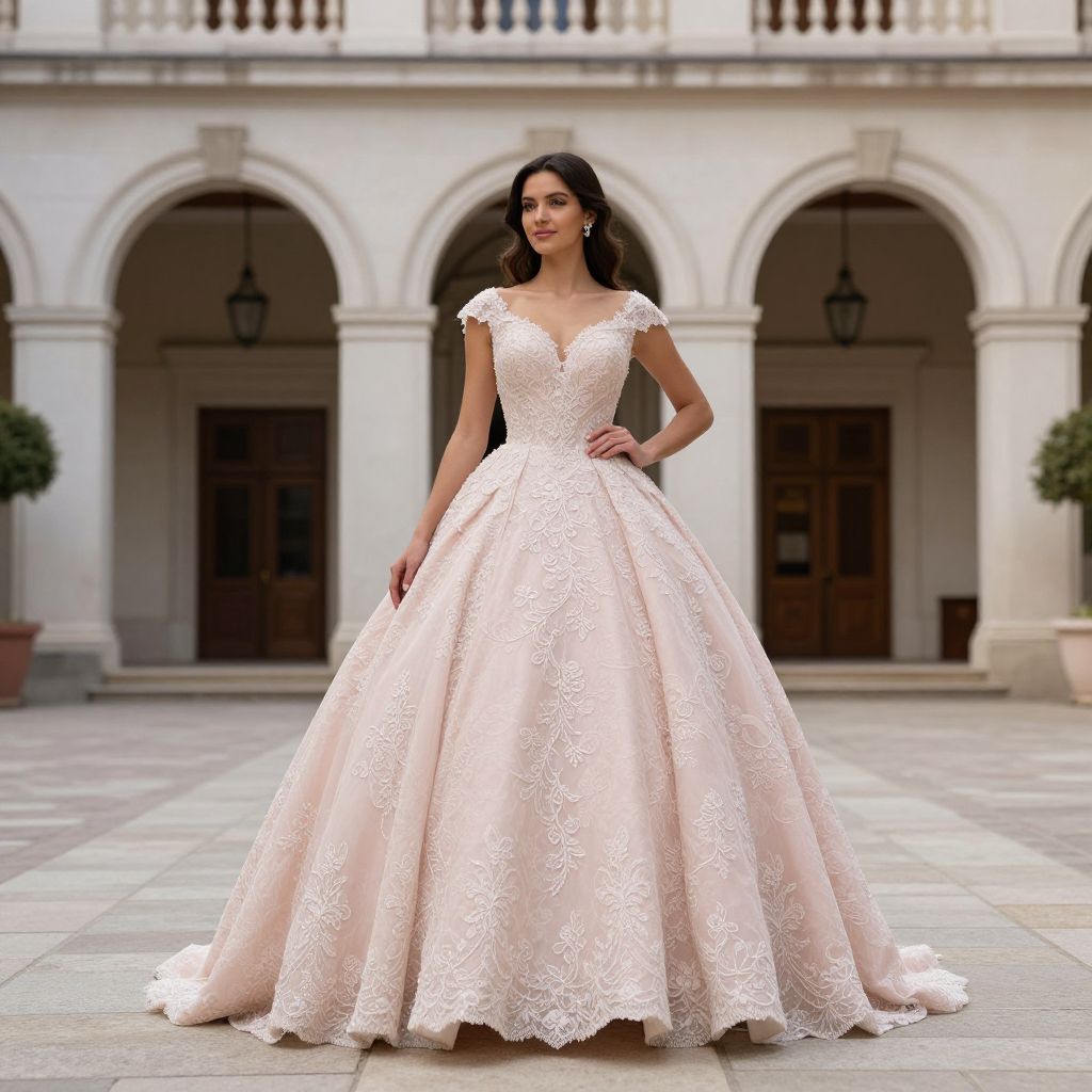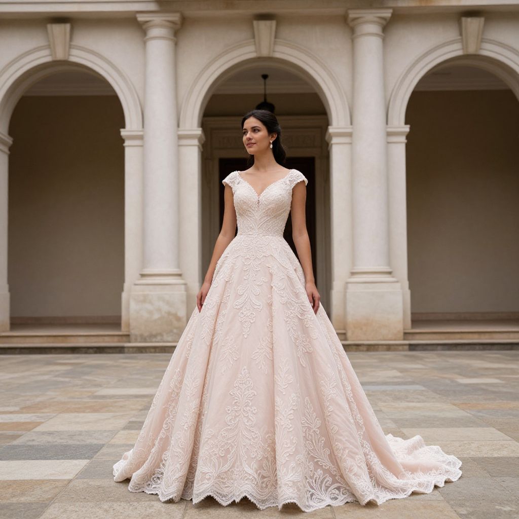 Elegant woman in a custom-made blush pink ball gown with intricate lace detailing stands gracefully in front of a classical building featuring arched doorways and columns, exuding timeless sophistication.