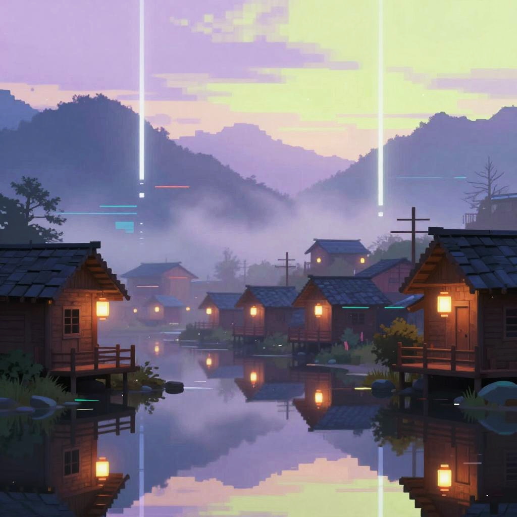 Digital abstract artwork of a vibrant bioluminescent swamp at midnight, a reflective surface mirroring a luminous sky. In the foreground: fecund glowing lilies and vaporous mist casting shimmering pixel reflections. The sky blends deep green, electric turquoise, bright magenta sliced by vertical white light columns. Modern retrofuturism, vaporwave accents, pixel-sorted textures, soft bloom, dreamy surreal mood, reflective symmetry, gentle haze, volumetric glow, subtle scanlines, long exposure shimmer, high detail, cinematic composition, evocative atmosphere.