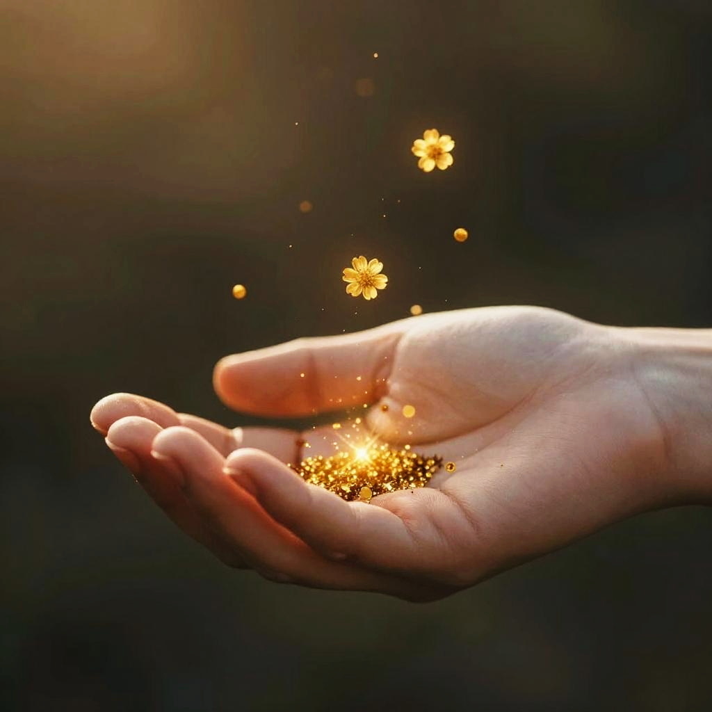 A close-up view of a human hand gently cupped, golden glowing particles and tiny golden flowers floating upwards from the palm, ambient soft lighting, warm gold color scheme, magical realism atmosphere, soft focus with bokeh light effects in the background, dark and blurred background emphasizing the glowing elements