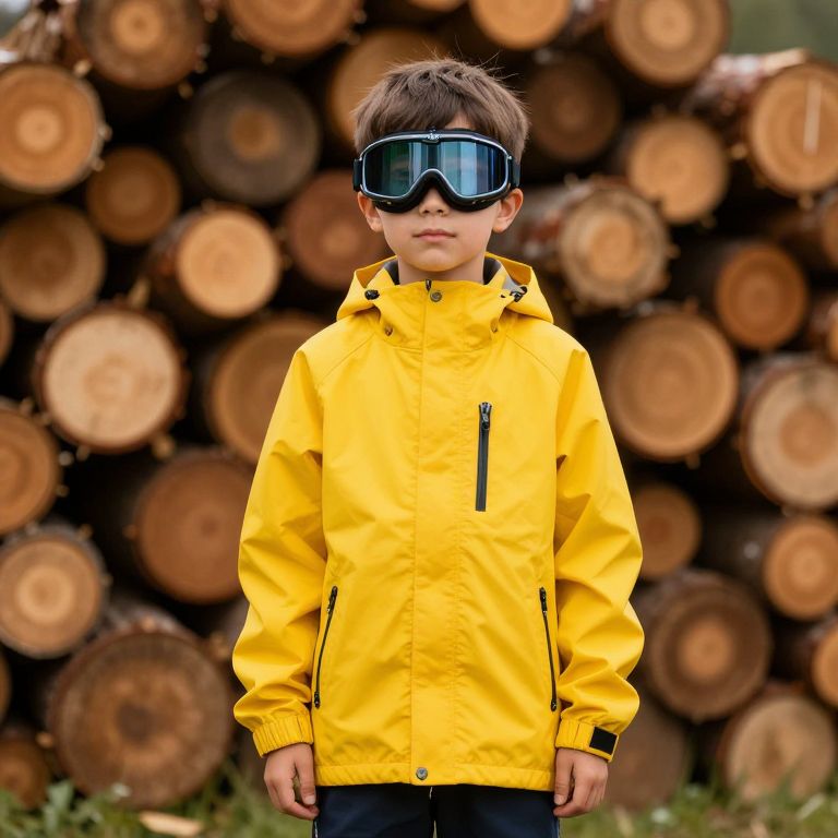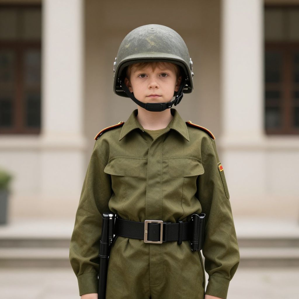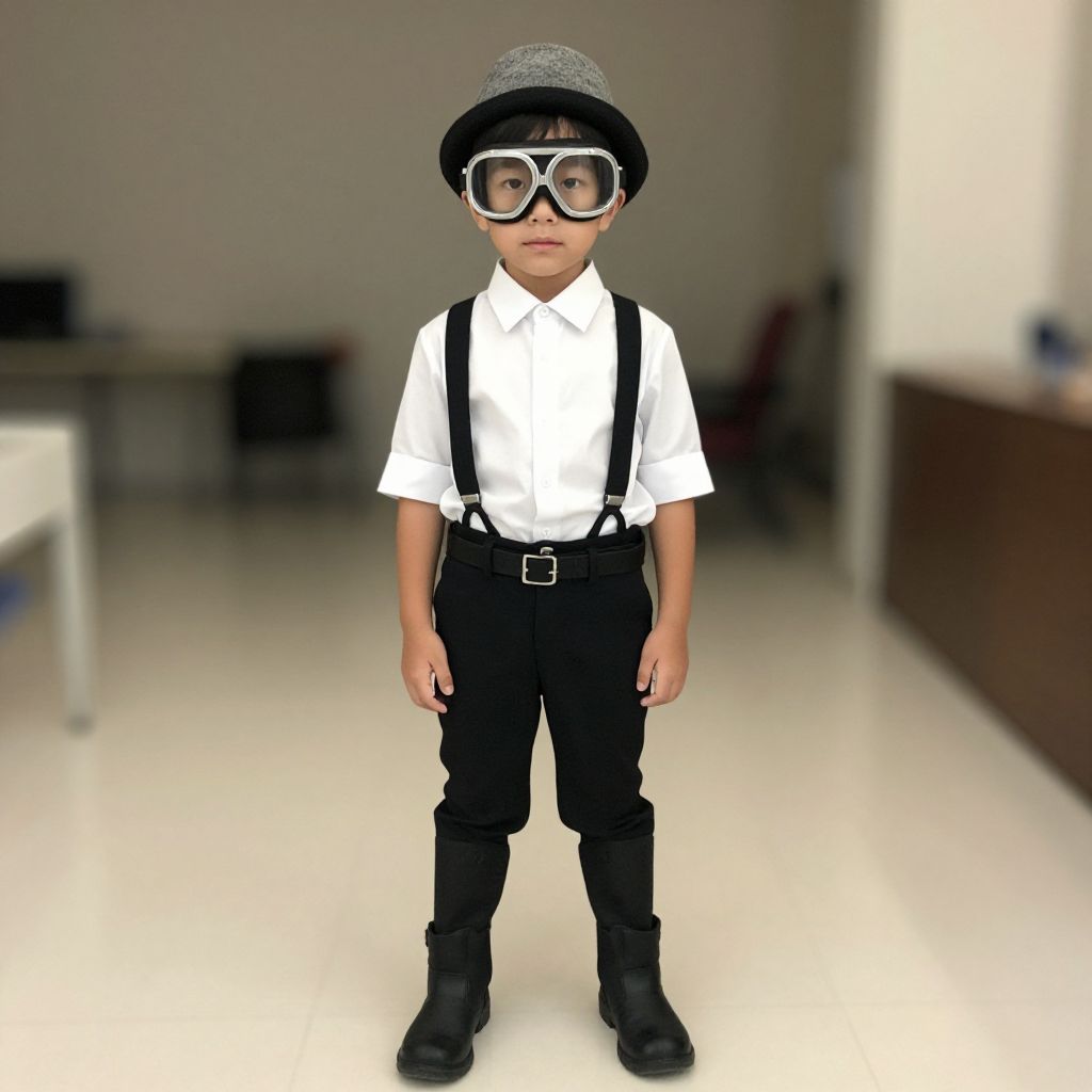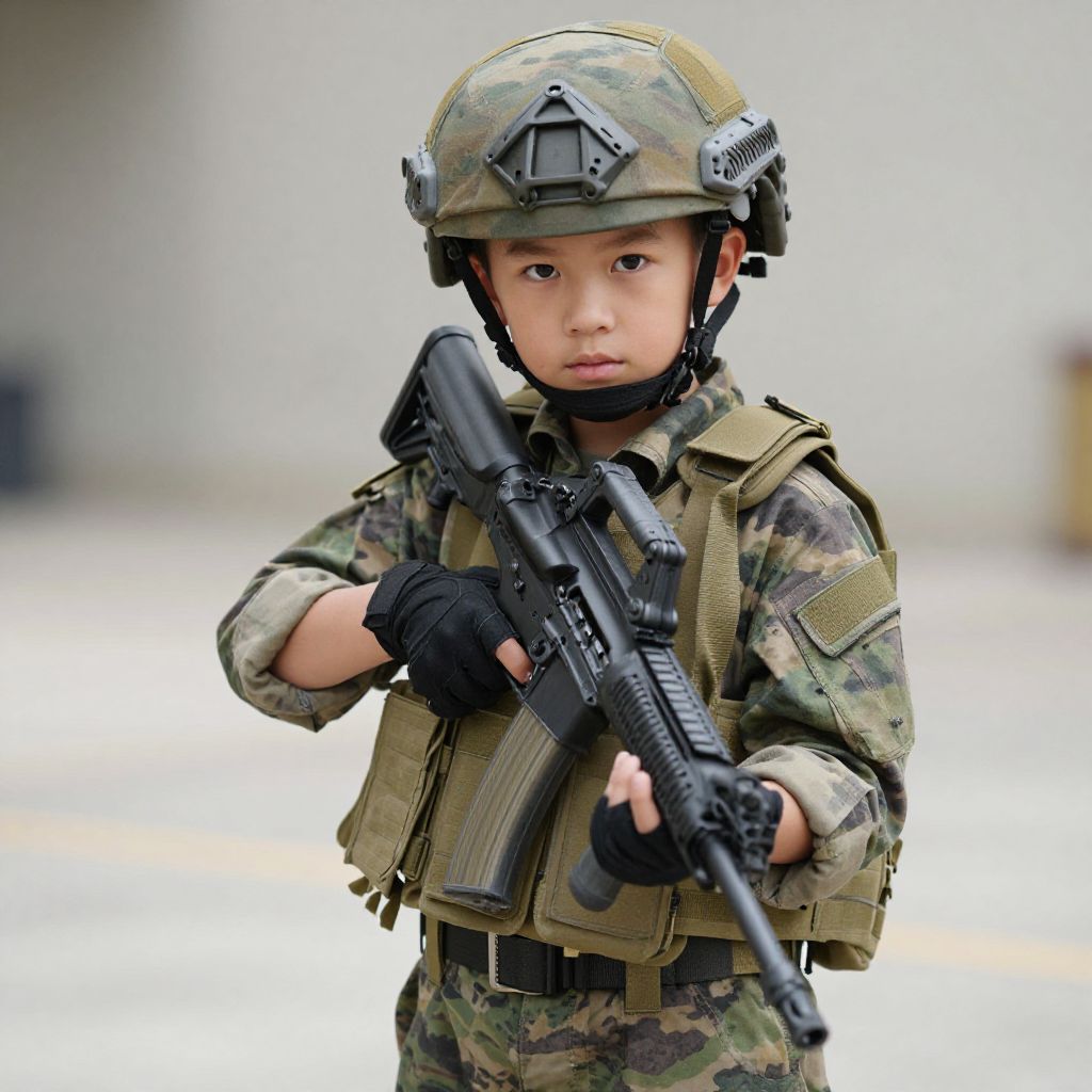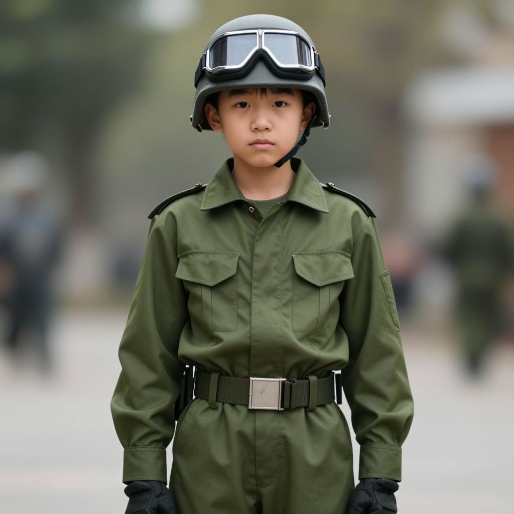 Photograph of a young Asian boy in a black helmet, goggles, and dark sunglasses, wearing a green military-style flight suit with a black belt,