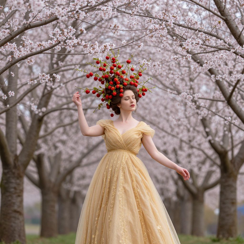 A woman adorned in a golden gown stands serenely beneath a surreal canopy of cherry branches, her hair entwined with vibrant red fruits that seem to defy gravity, creating a dreamlike fusion of human form and nature.