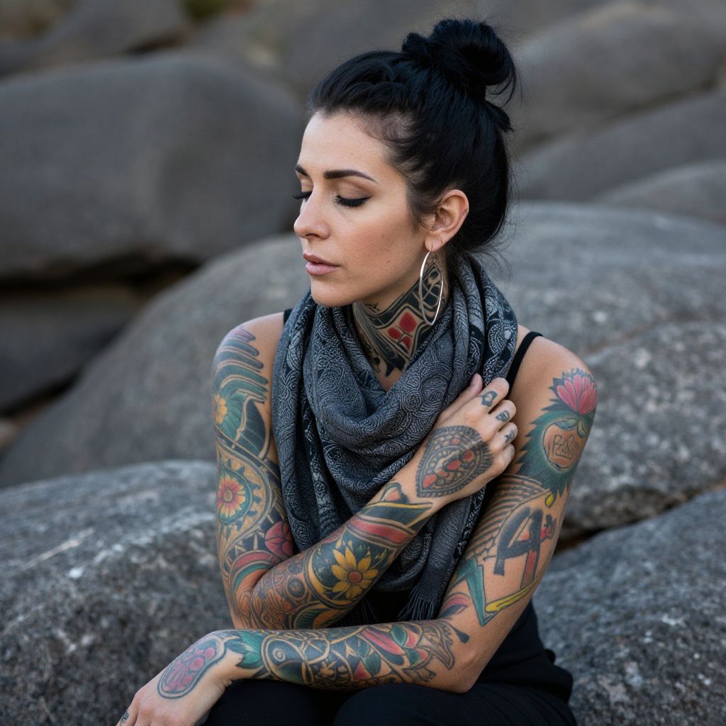 Photograph of a heavily tattooed woman with vibrant red hair, styled in loose waves. She's wearing a black sleeveless shirt with a colorful floral design on the front. Her arms and chest are covered in intricate tattoos. She's standing against a textured, brownish background, looking down with a subtle, pensive expression. The image has a slightly grainy, vintage filter.