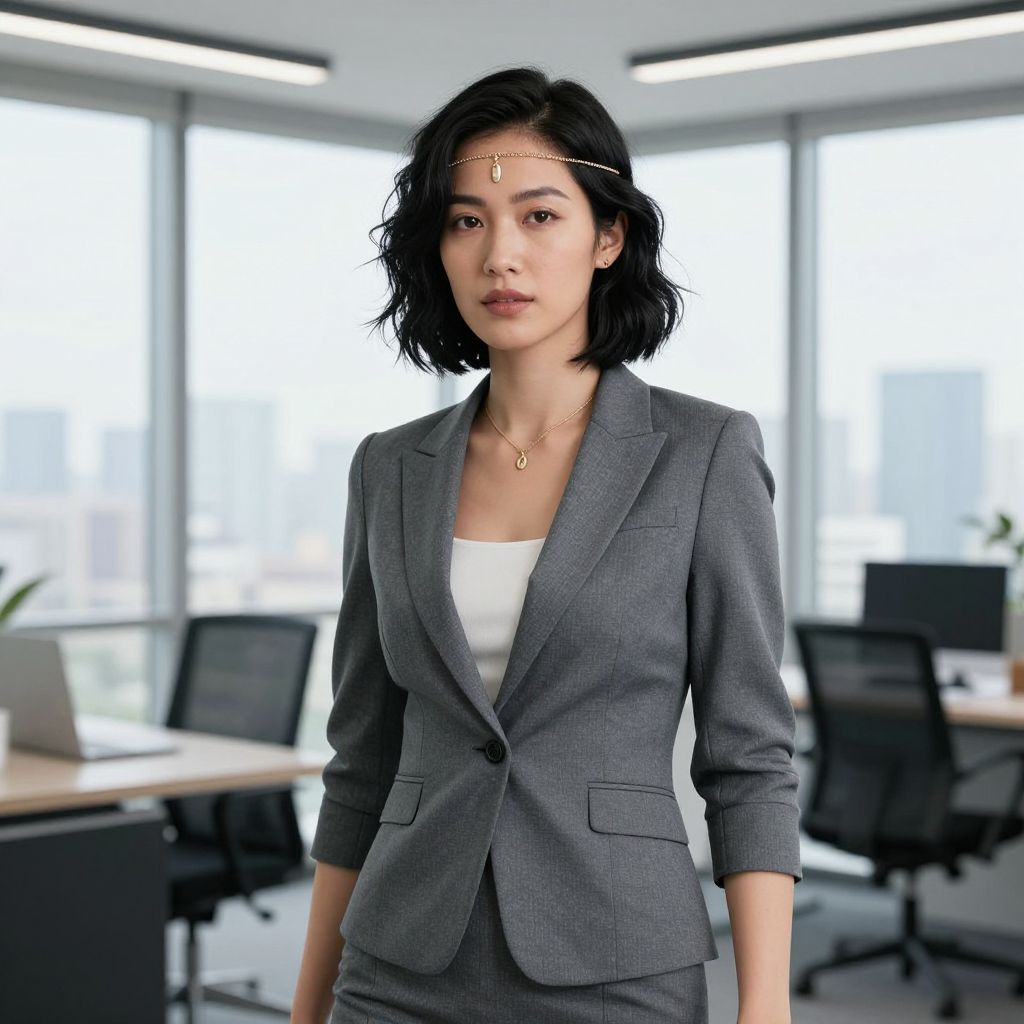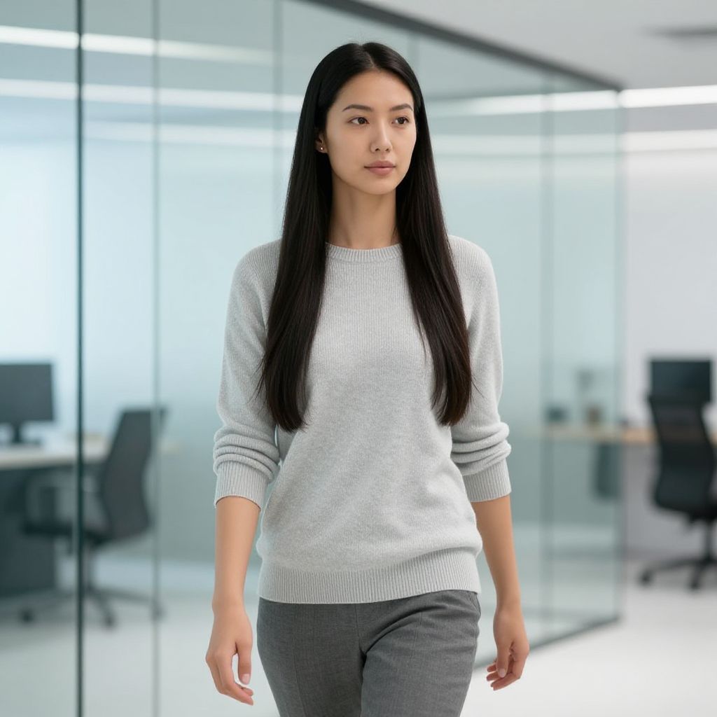 Woman with sleek, straight long hair, walking through a glass-walled professional workspace, wearing a subtle knit sweater, minimalist accessories, clean lines, futuristic yet approachable environment, polished and confident appearance