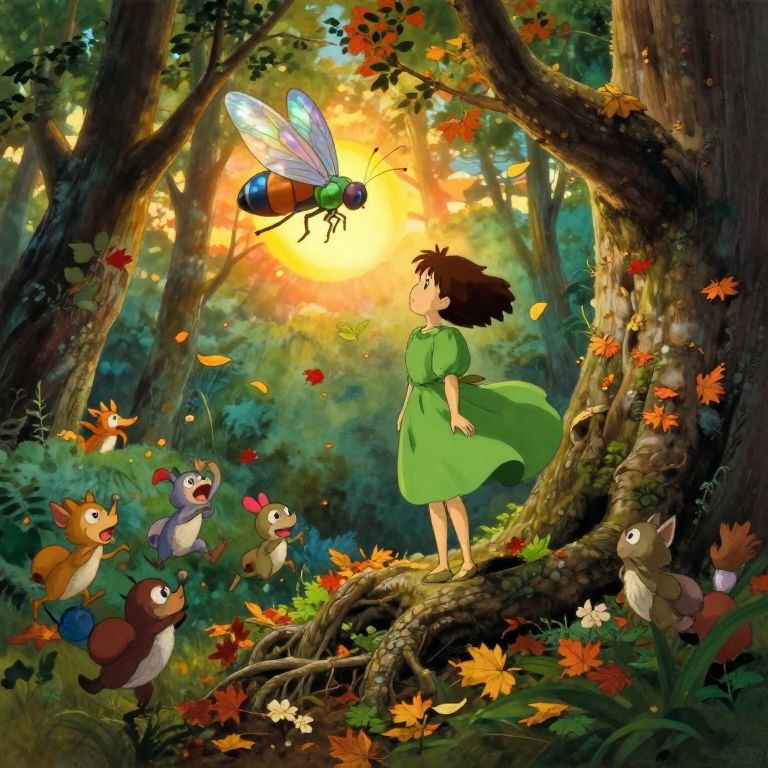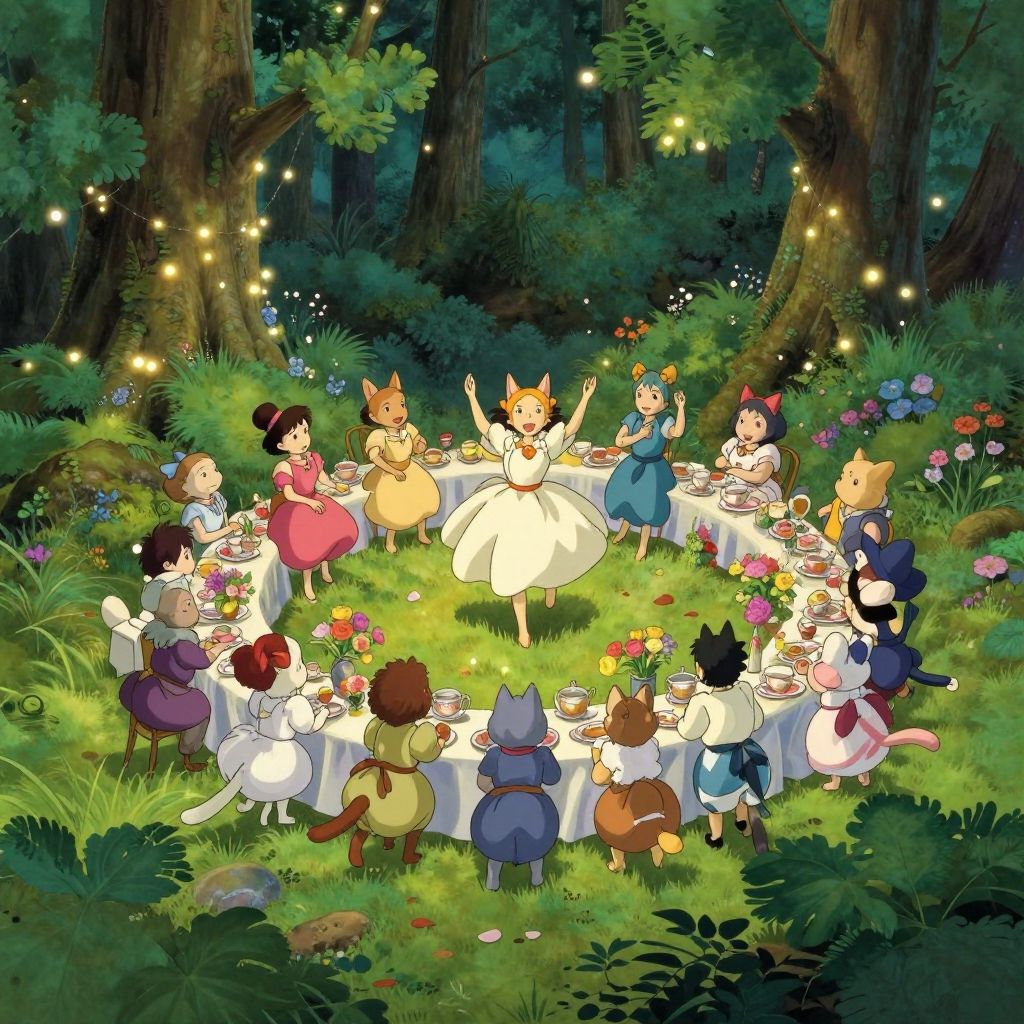A captivating watercolor scene unfolds from an aerial perspective, showcasing a whimsical tea party in an enchanted forest. The enchanting landscape is reminiscent of Studio Ghibli's dreamy worlds, with intricate table settings and teacups adorned with floral patterns set amidst vibrant green foliage. A charming gathering of animated woodland creatures surrounds the table, each exhibiting unique personalities as they engage in lively conversations and playful antics, creating a magical atmosphere that is both captivating and endearing. The soft pastel color palette and gentle watercolor brushstrokes evoke a sense of wonder and tranquility, inviting viewers to immerse themselves in this delightful, otherworldly encounter.
