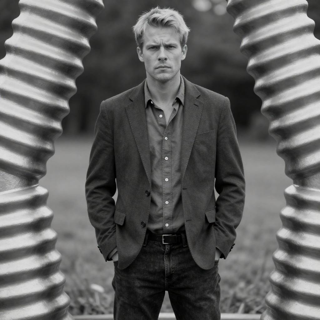 Black-and-white photograph of a serious, blonde man with a stern expression, wearing a dark blazer over a button-up shirt and jeans. He stands with hands in pockets, surrounded by large, metallic, ribbed structures that frame him. The background is a blurred, grassy outdoor setting.
