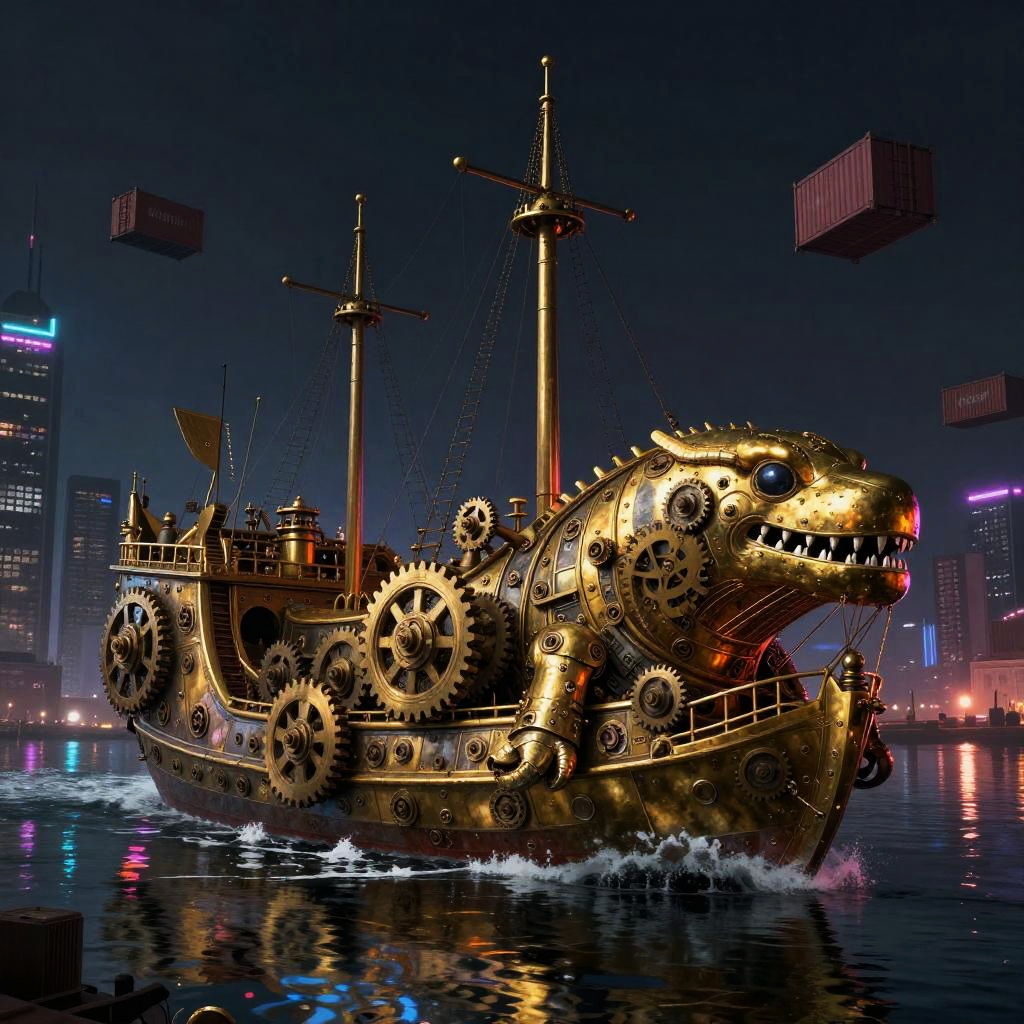 A highly detailed digital painting of a colossal clockwork leviathan ship with brass plates and exposed gears sailing on oil-slick midnight harbor reflecting neon skyscrapers and drifting containers, with sharp neon rim lighting with deep shadow pools and reflective specular highlights illuminating the intricate details of the ships, in a dark and brooding atmosphere. High quality and hyperrealistic.