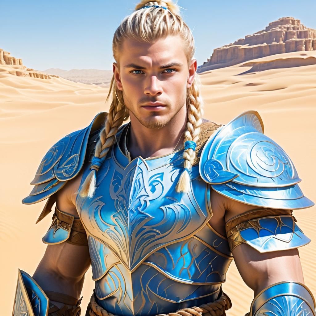 Portrait of a muscular young Norse warrior with pale skin, braided blonde hair, and glowing blue eyes. The subject is wearing intricately designed blue and gold armor with shoulder guards and arm bracers, standing in a desert landscape with sand dunes and rocky formations in the background.