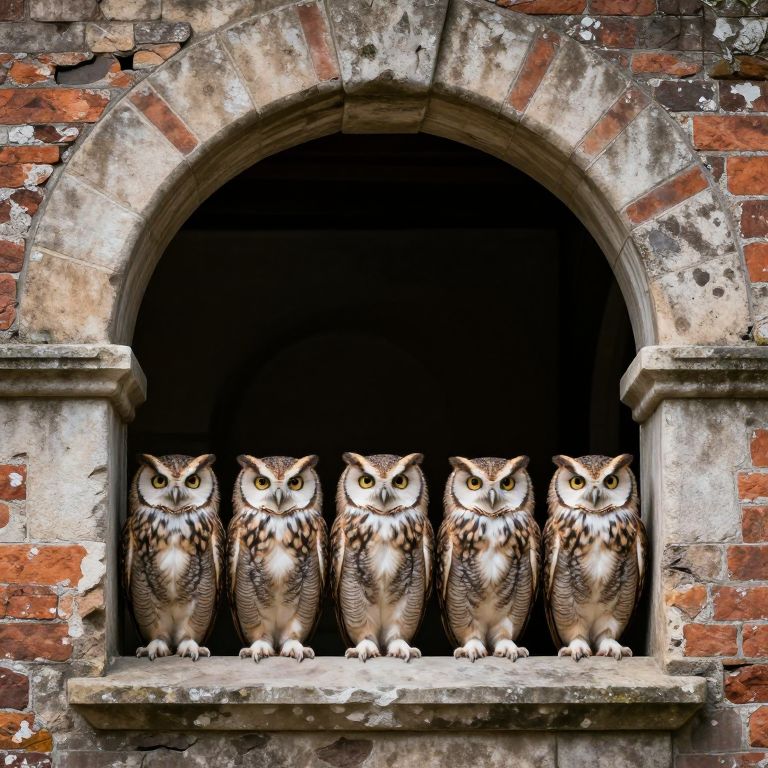 Seven owls with human-like faces stand solemnly in a row, their piercing eyes fixed forward as they gather beneath a grand stone archway, framed by ancient, weathered bricks that lead into a dimly lit chamber beyond.