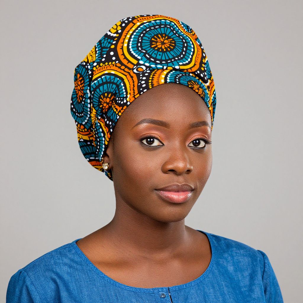 Photograph of a young Black woman with dark brown skin and a calm expression, wearing a vibrant, patterned headwrap in blue, orange, and yellow, with intricate circular and floral designs. She has almond-shaped brown eyes, subtle pink lipstick, and is dressed in a royal blue, simple, cotton top with a round neckline. The background is a plain, light gray, which makes her colorful headwrap and blue shirt stand out prominently. The image is well-lit, highlighting her smooth skin and the vivid colors of her attire.