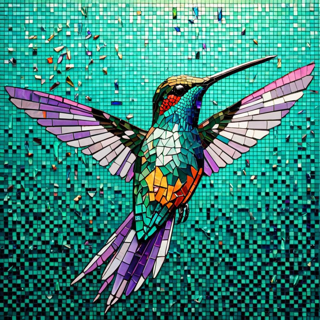 A detailed digital artwork of a peacock with vibrant mosaic feathers in turquoise, emerald green, gold, and metallic colors. The mosaic pattern creates a pixelated and fragmented effect, giving the bird depth and a luminous, surreal quality. The peacock's tail feathers are fully displayed, emphasizing intricate patterns and rich colors.