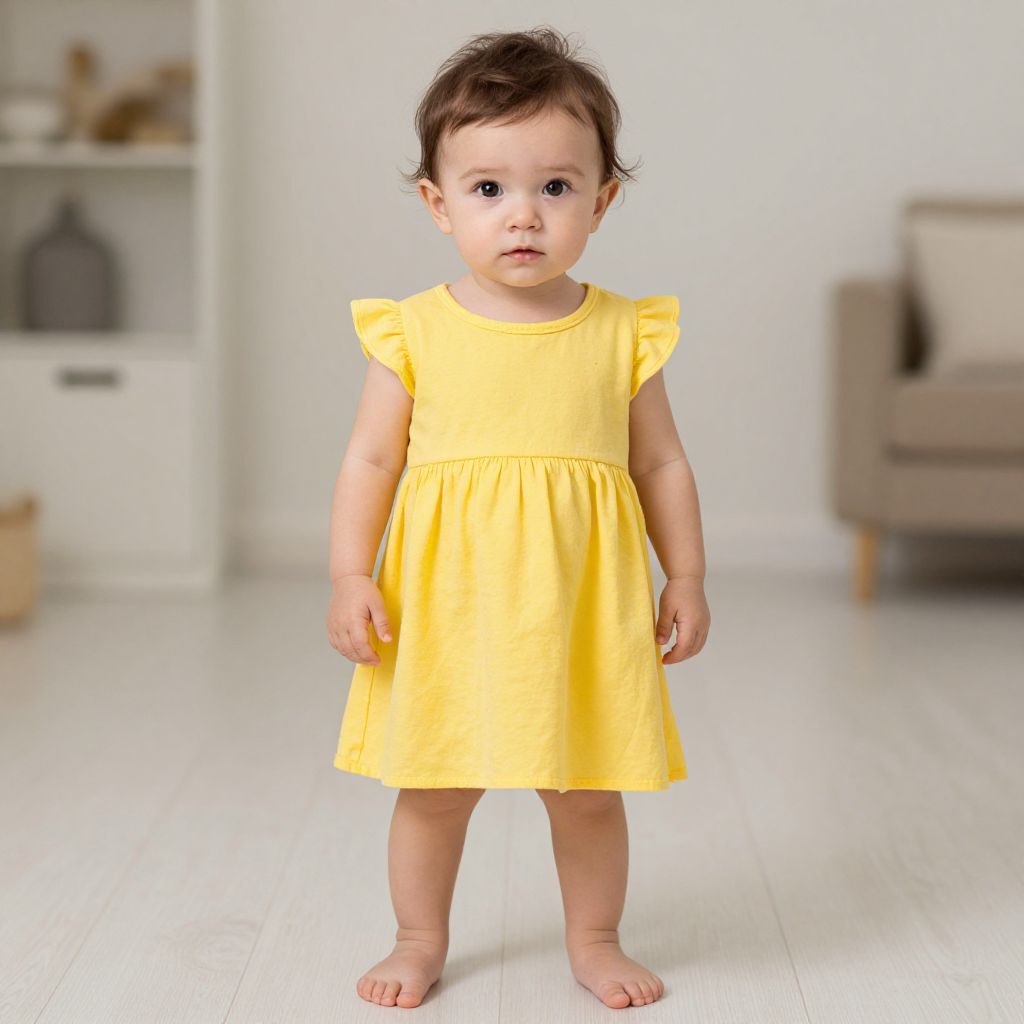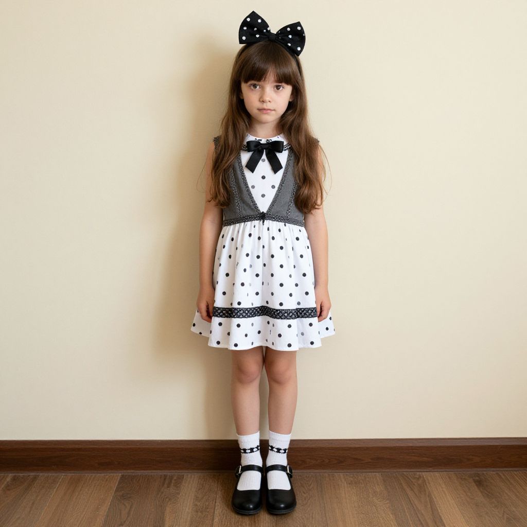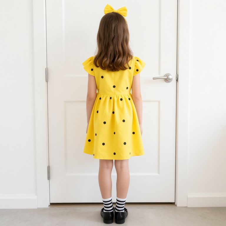 Girl with brown hair wearing a yellow dress with black polka dots and black and white striped socks and black shoes. She has a yellow bow on her head and is standing in front of a white door.