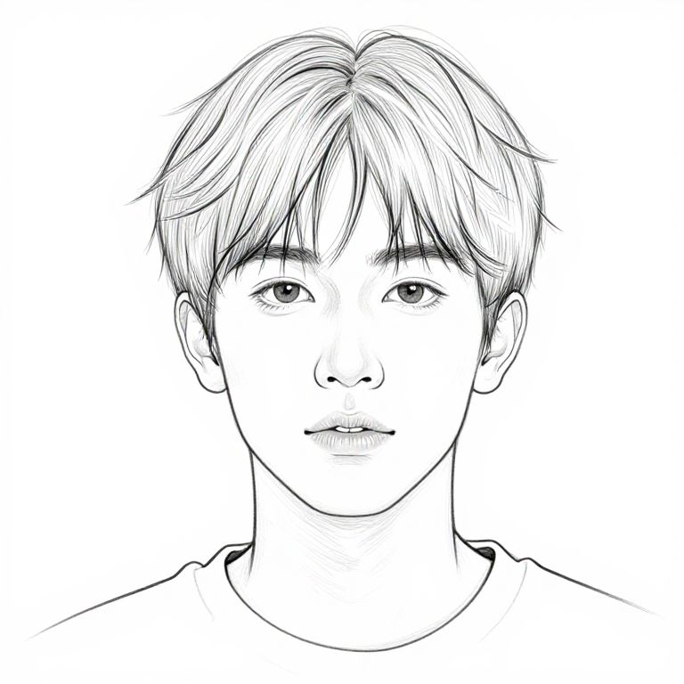 Black-and-white digital line drawing of a young man with short, slightly messy hair, neutral expression, and simple shirt, centered against a blank background.