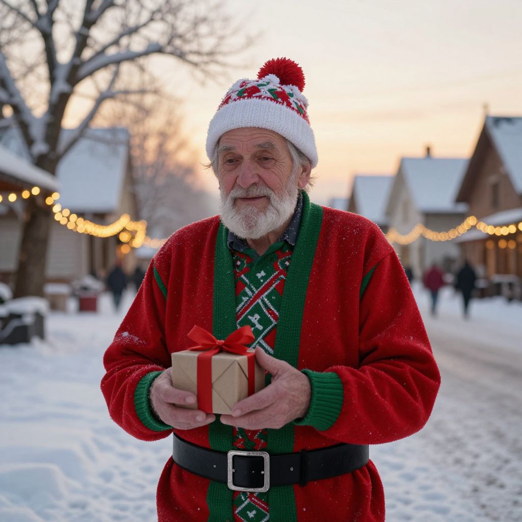 An elderly man with silver hair gently streaked with white, wearing a festive red and green Christmas outfit, complete with a traditional white knit hat adorned with a red pompon and a black belt with a silver buckle, stands in a serene snowy winter scene beneath a soft, golden sunrise. Christmas lights twinkle warmly in the background, casting a cozy glow over the frost-kissed trees and a quiet village street. His weathered, kind face bears a gentle, nostalgic smile, as he holds a small wrapped gift in his calloused hands. The atmosphere is filled with holiday cheer, quiet warmth, and a sense of timeless tradition—capturing the spirit of winter wonder and family memory.