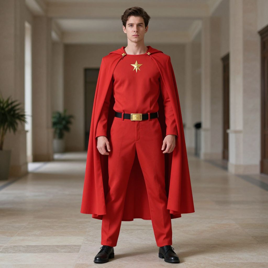 Photograph of a young, handsome man with short brown hair, wearing a red superhero cape and suit with a gold star, black belt, and black