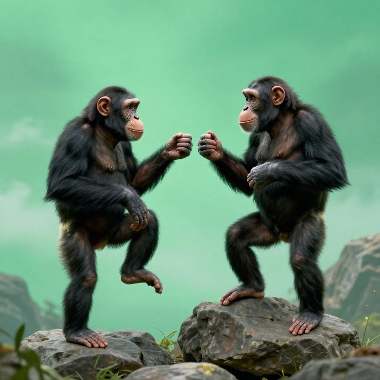 Two chimpanzees in vestments of reason stand poised atop ethereal rocks, their gestures echoing a silent dialogue of intellect and emotion, suspended in a dreamlike emerald sky where gravity yields to the weightless pull of philosophical inquiry.