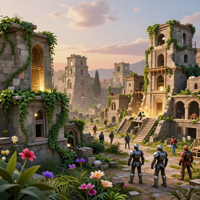 Photorealistic digital painting of a sunlit, ruined medieval city with ivy-covered stone buildings, colorful flowers, and armored figures exploring.