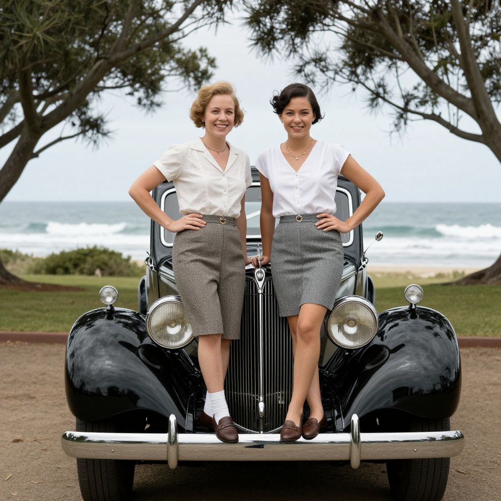 Man and woman posing confidently atop the front bumper of a classic Studebaker, captured at Southport, Queensland, in 1937, with the ocean and trees visible in the background.