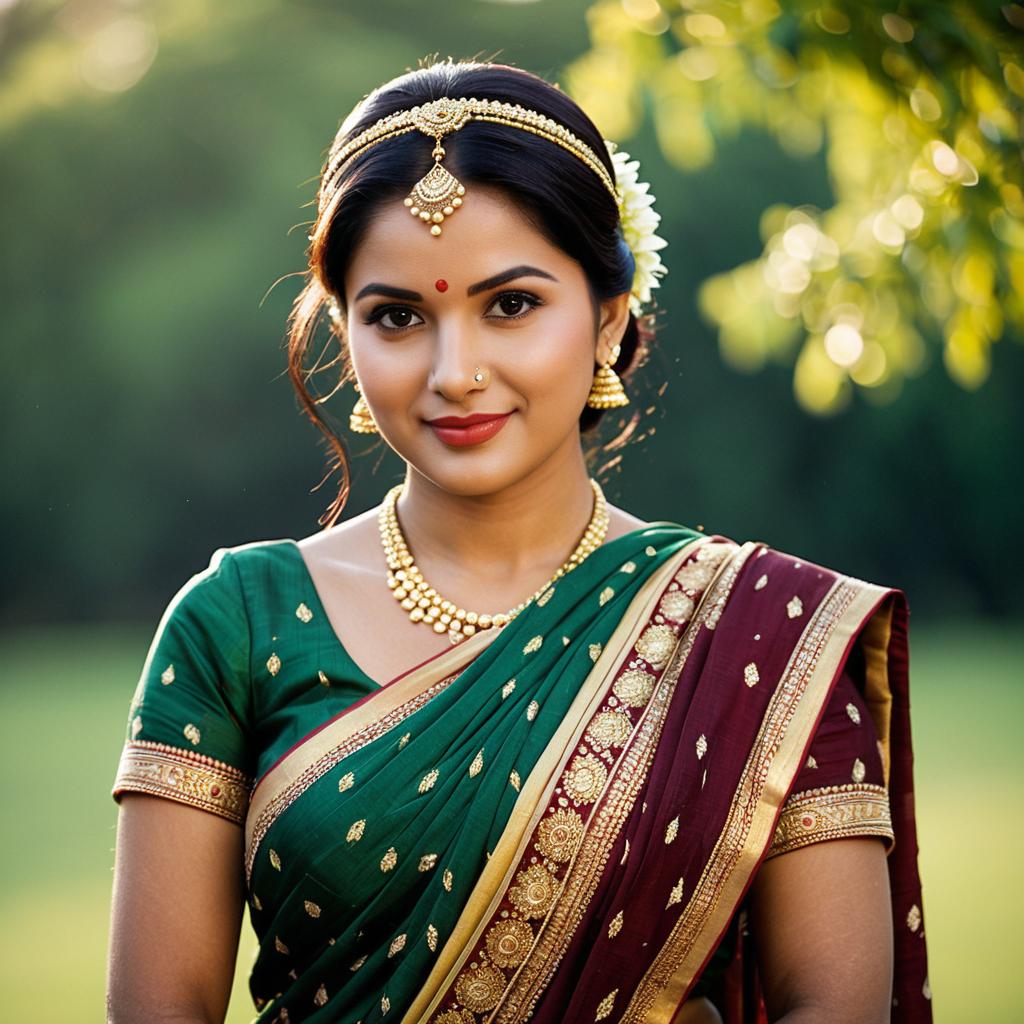 Photorealistic portrait of an Indian woman wearing a traditional green and gold saree with a maroon blouse. She is standing outdoors with a blurred green natural background, adorned with intricate golden patterns on her saree and blouse. Her dark hair is styled in an elegant updo decorated with a gold hair accessory and white flowers. She wears traditional gold jewelry including earrings, necklace, and nose ring. The image features natural makeup, soft sunlight, and a slight smile, highlighting ethnic beauty with warm colors and a bokeh effect.