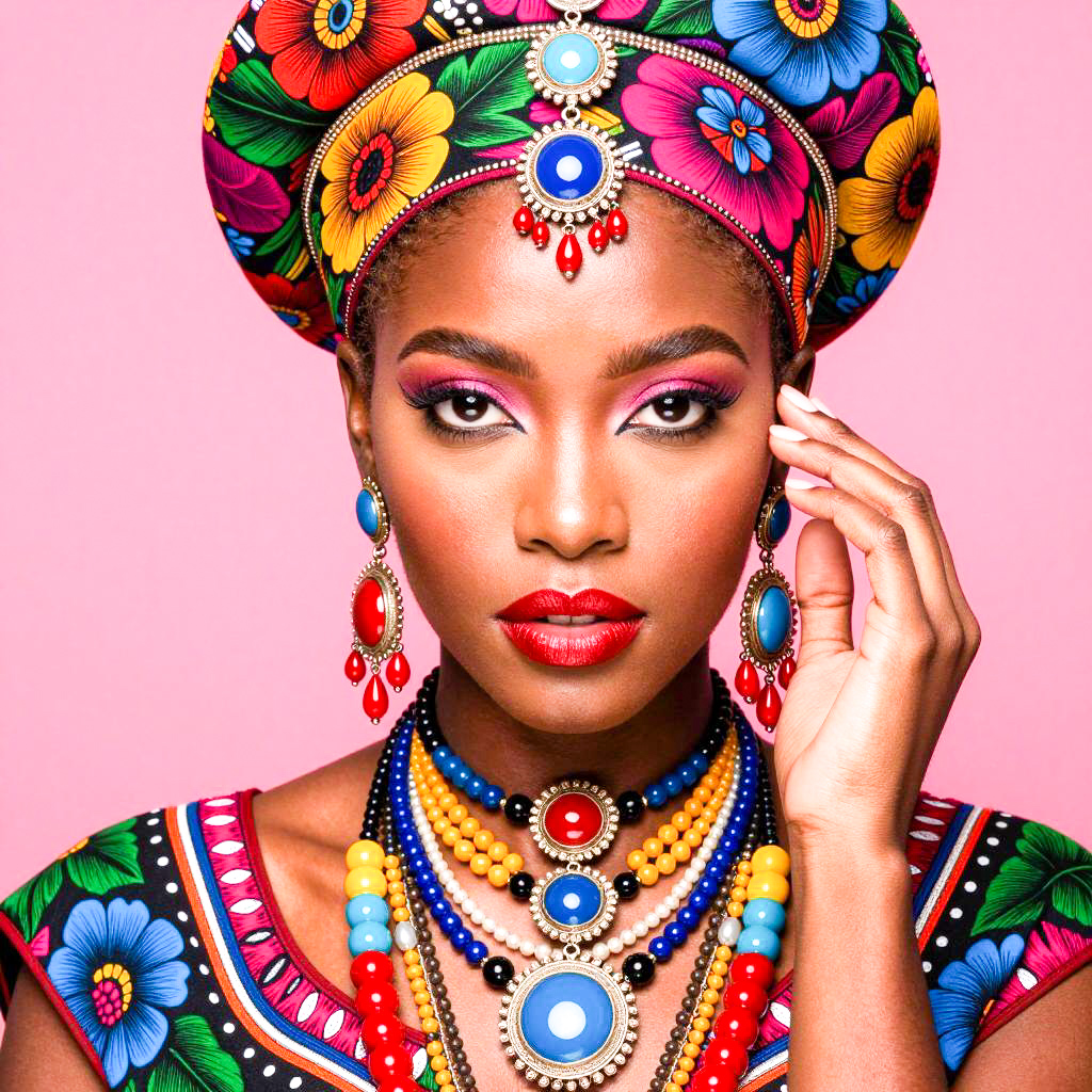 Dark-skinned woman with intense gaze, wearing vibrant, ornate headpiece and jewelry, colorful floral patterns, bright pink background. Multicolored earrings, intricate facial adornments, layered necklaces. Hand near face, red lips, detailed makeup. Close-up portrait, vivid colors.