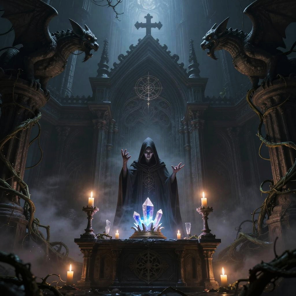 Dark fantasy AI art generator creating a surreal landscape of twisted gothic castles under a blood-red moon, with shadowy figures cloaked in mist, intricate armor, and glowing runes, blending mysticism and technology in a haunting, ethereal style.