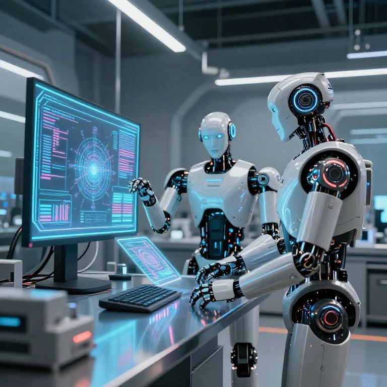 2-3 futuristic robots collaborating in a sleek laboratory filled with holographic displays and advanced technology, metallic surfaces reflecting neon lights, detailed sci-fi environment, cinematic composition