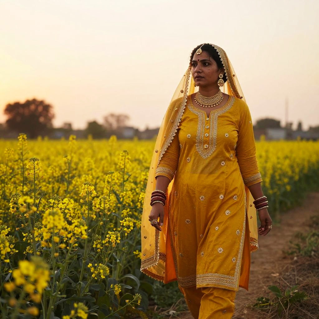 North indian women in rural setting, wearing elegant salwar kameez, walking through mustard fields at sunset, warm golden tones, expressive faces, rich cultural heritage